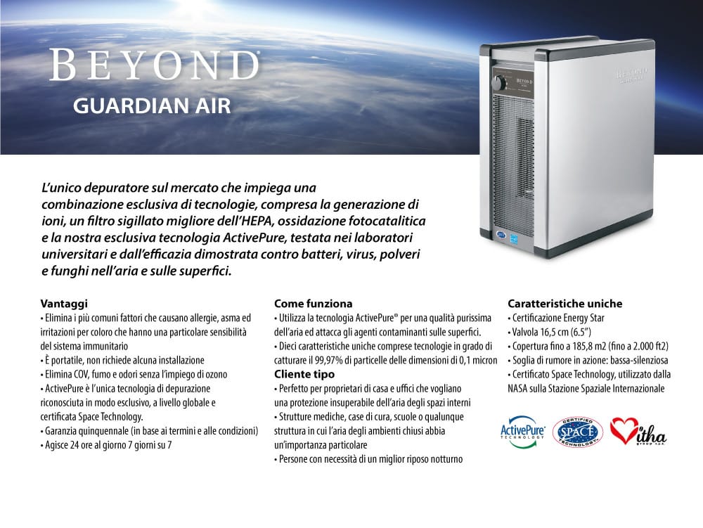 Beyond Guardian Air con la sua tecnologia Active Pure, protegge, sanifica e purifica la tua aria e le superfici 24 ore su 24, 7 giorni su 7.